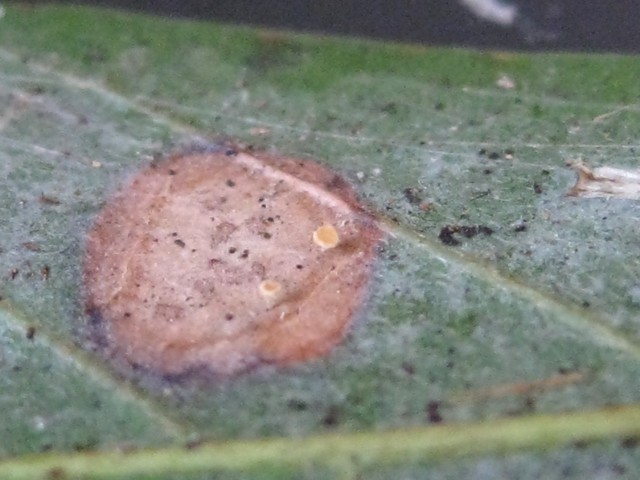 アラカシ (Quercus glauca) の生葉病斑部の裏面に発生していたもの。