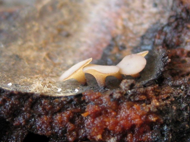 ドングリの総苞に生じる。子嚢盤は椀形からビョウ型に開き、径 2-4 mm.、子実層面は淡いベージュ色ないしやや紫色を帯びた淡橙褐色、縁は全縁、僅かに濃色に縁どられる。