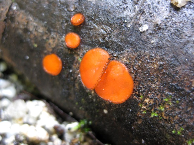 子実体は普通は群生する。子嚢盤は初め半球形から浅い椀状、後には平らな皿形に開き、径 4-8 mm。子実層面は平滑で赤橙色。