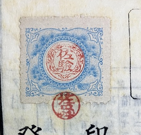 青色単色、唐草模様枠、四隅に雁金紋、中央に丸枠があり、外側には松が描かれ、丸枠内に "佐驗" の丸印が朱で押されている。割印は "佐舜" の丸印。