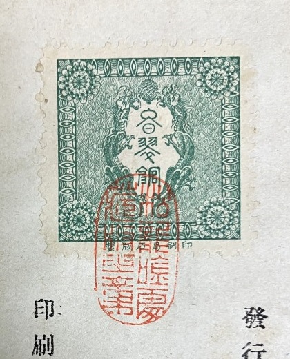 は奥付上部に貼られている。32 × 32 mm.、版面 27 × 27 mm.、目打あり、石版。