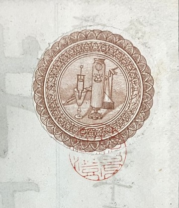 標題紙の四隅にも同様の器具がデザインされているので、検印紙を作成したのは標題紙と同じ知新堂だろう。