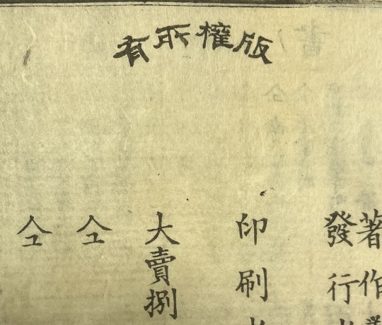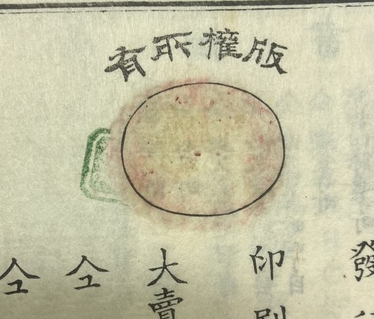 上部に弧状に "版權所有" とあり、検印紙は貼られていない。なお、枠外右下に "巻九" とある。