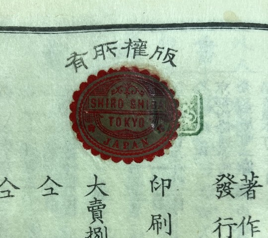 は奥付上部に貼られている。34 × 50 mm、版面 30 × 46 mm、ルレットあり、平版に見える。