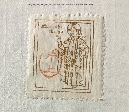 は縦長方形、32 × 30 mm.、版面 27 × 22 mm.、茶色単色、目打ちあり、枠内上部に "Daiichi shobo" とある。