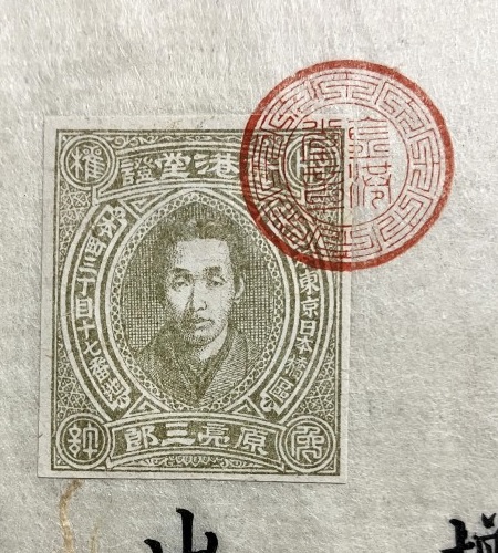 また、同じ印面の割印が押されているが、この割印が同一のものだとすると検印紙の大きさは私が調べたものよりも小型(比率で計算すると版面縦は約 25 mm.)である。