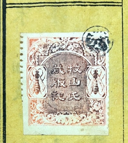 くすんだ赤色で色ムラがある。唐草模様の枠があり、中央に "牧山氏藏版記"、左右に蜂の絵がある。割印は小さな丸印が黒で押されている。