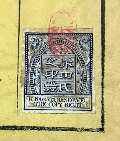 濃藍色単色、周囲は唐草模様、中央枠内に "永田氏之印證"、下部に "K. NAGATA RESERVE THE COPY RIGHT" とある。