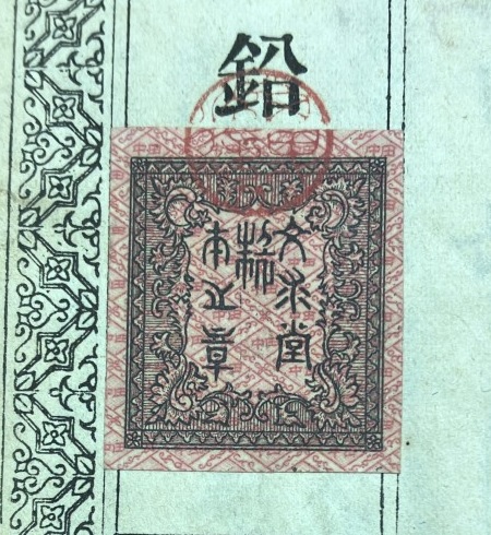 は標題紙左下部、"文求堂鉛版" の "版" の上に貼られている。28 × 24 mm.、版面 24 × 21 mm.、目打なし、平版に見える。